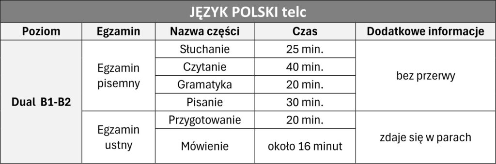 Szczegółowe informacje o strukturze egzaminu oraz przykładowy test z języka polskiego na poziomie dualnym B1-B2 znajduje się pod linkiem: https://www.telc.net/en/language-examinations/certificate-exams/polish/telc-polish-b1b2-school/